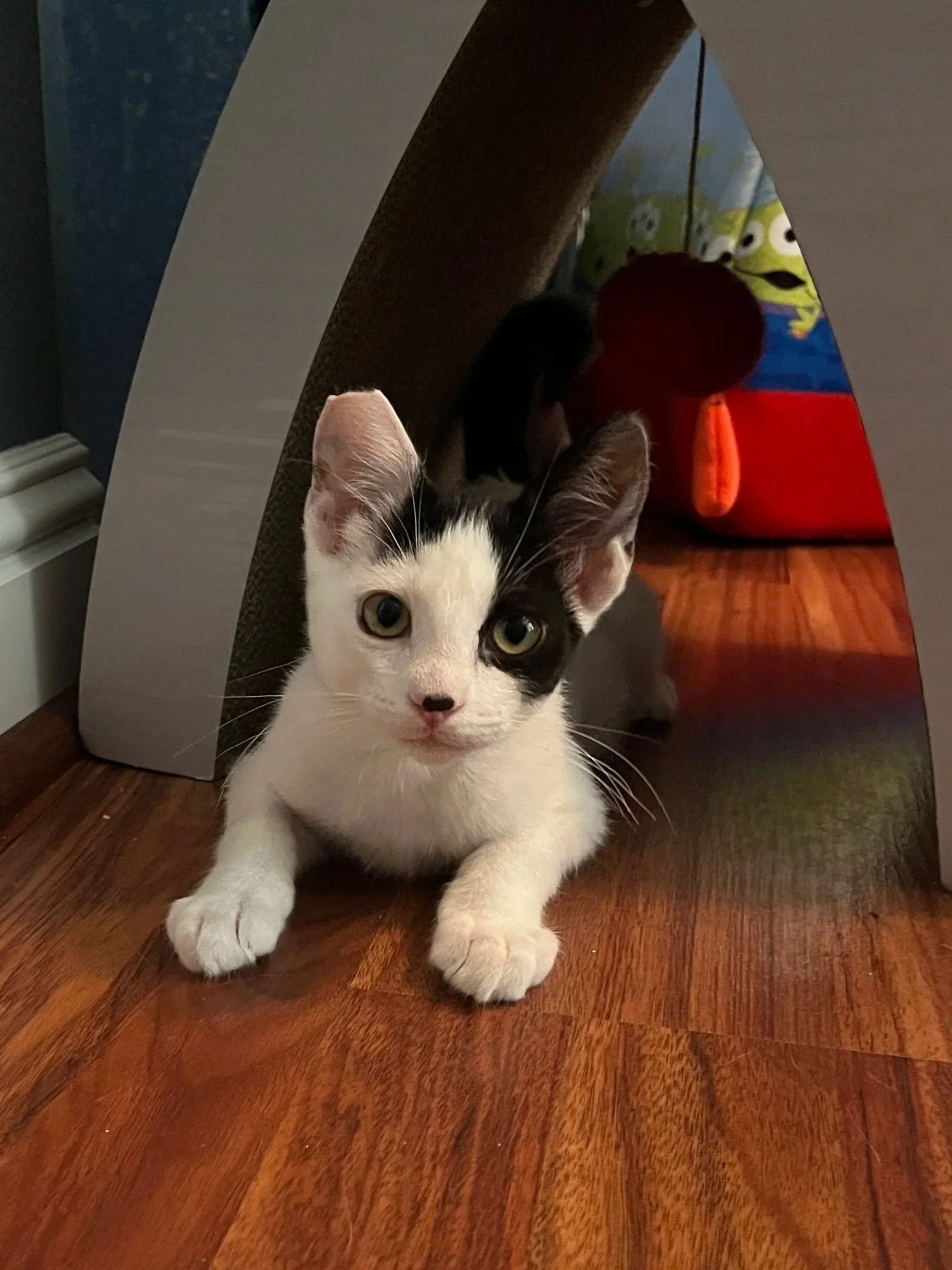 This little guy is a survivor! He was rescued from a 40+ cat colony as a tiny kitten. He had a giant abscess on his face, and needed emergency surgery. He has flourished into the sweetest most gentle kitty. He is about 6 months old and has been waiting for his furever home. He loves to play fetch, cuddle, and play with other cats. He is the purrfect addition!